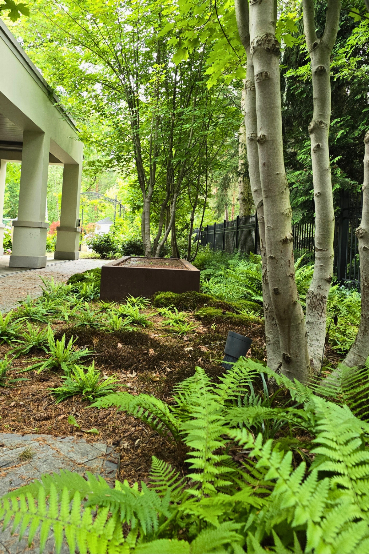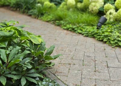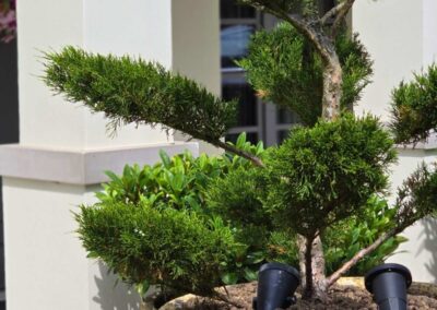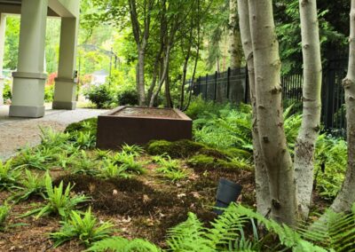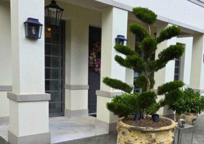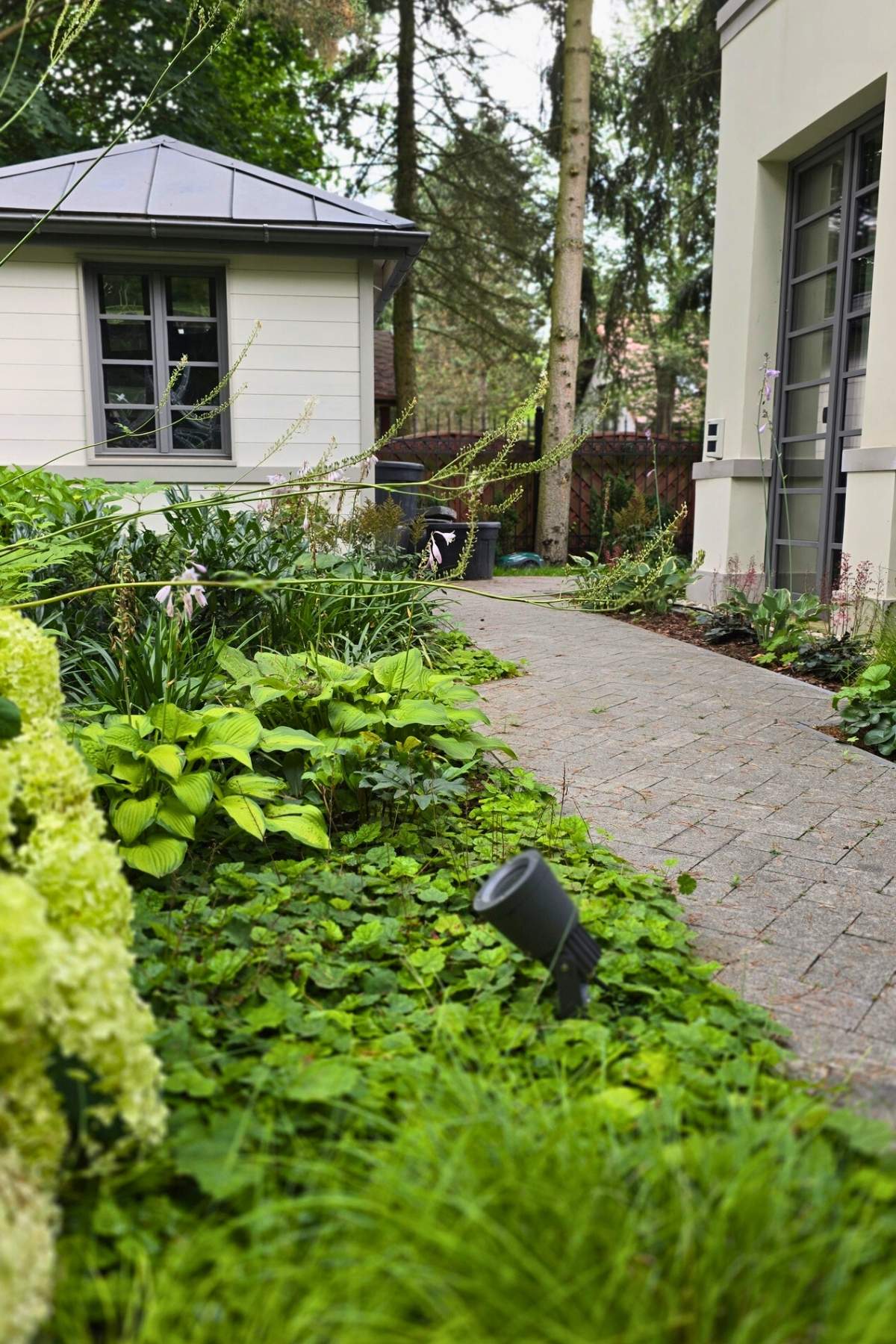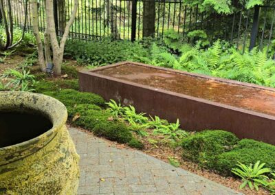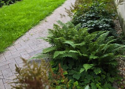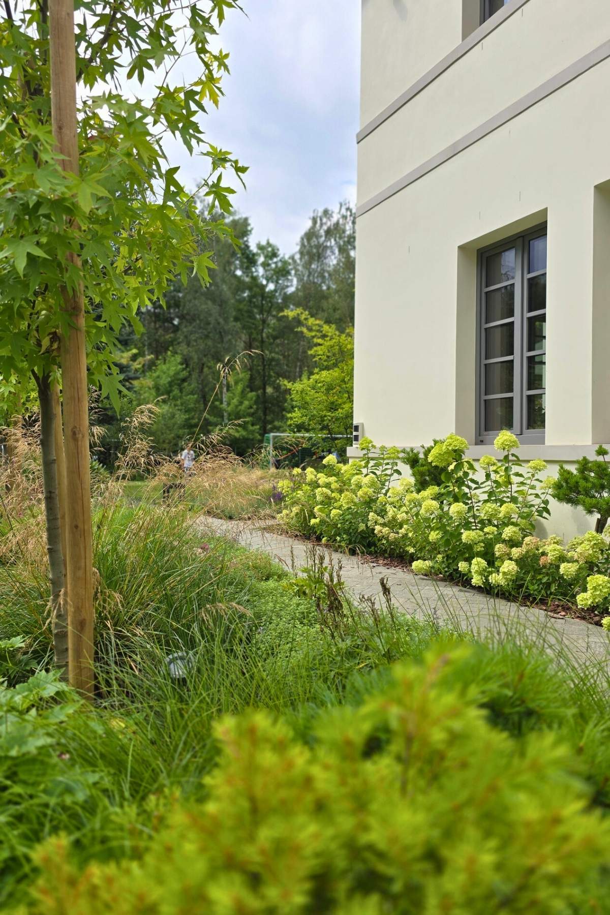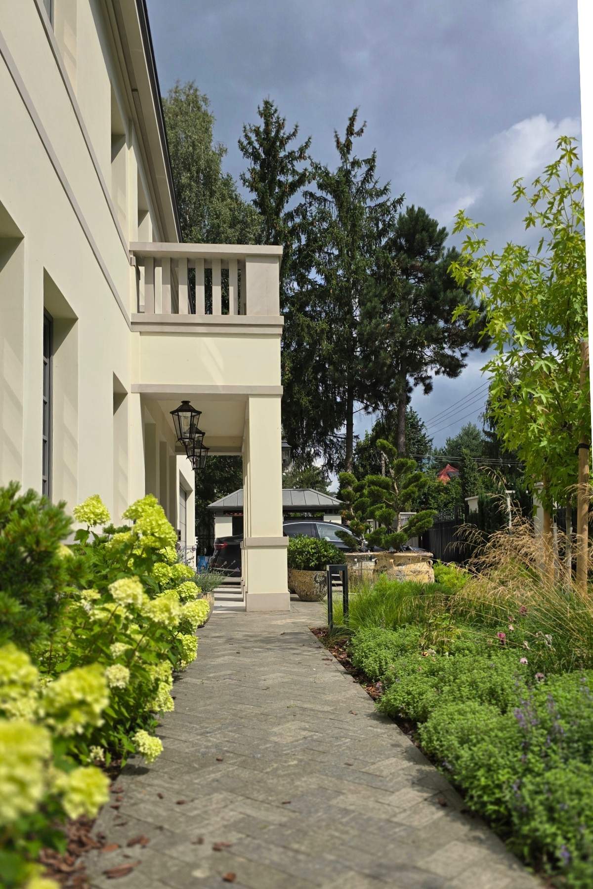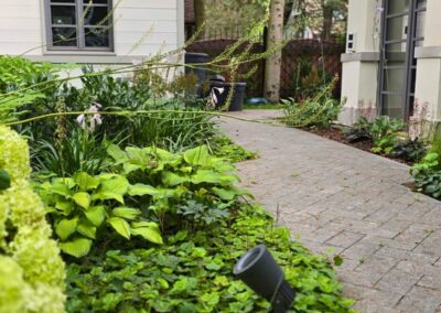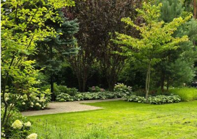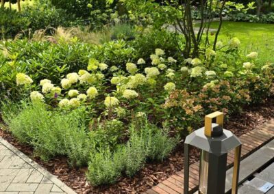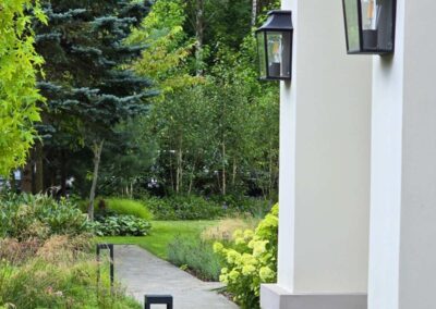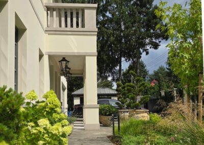 Kompozycja opiera się na spokojnych, zielonych nasadzeniach, naturalnych materiałach oraz czytelnych liniach ścieżek i rabat wykończonych szlachetnymi materialami, które podkreślają reprezentacyjny charakter miejsca. Starannie dobrane rośliny tworzą zmienny, sezonowy obraz ogrodu – od strukturalnych form zieleni po kwitnące akcenty bylin i krzewów. Akcentami są elementy wodne, donice, formowane krzewy iglaste.
