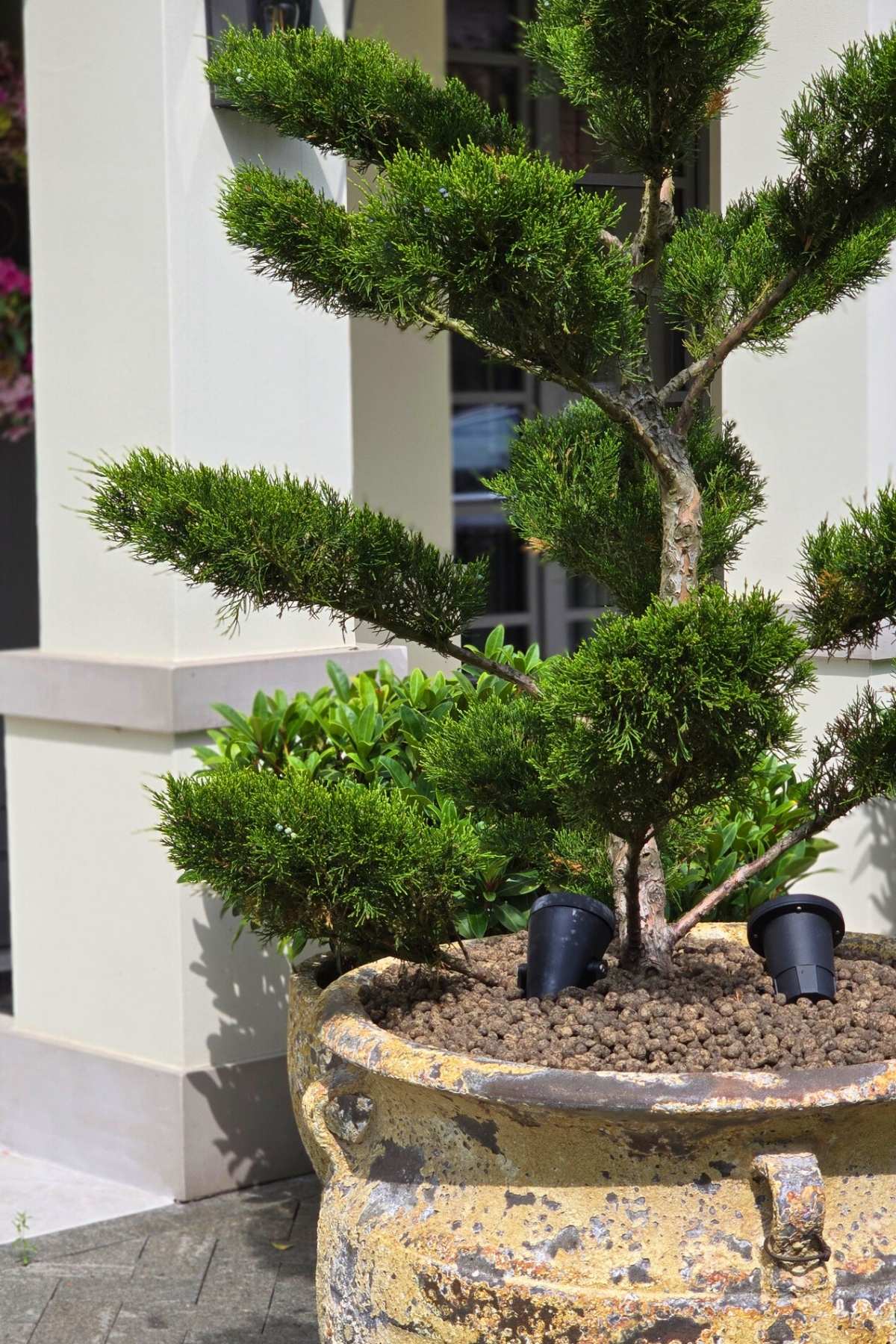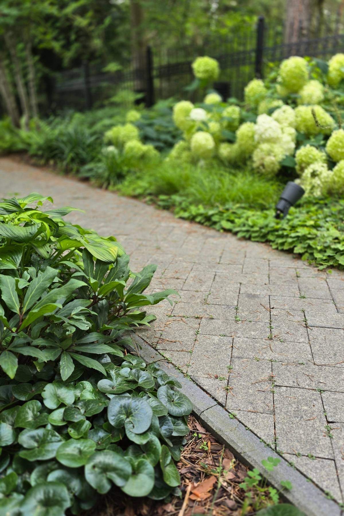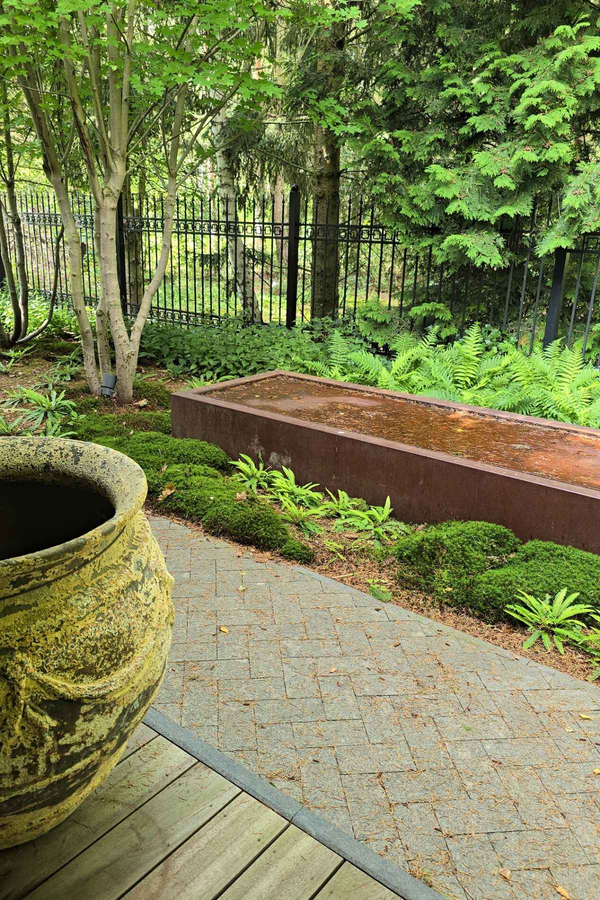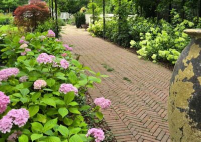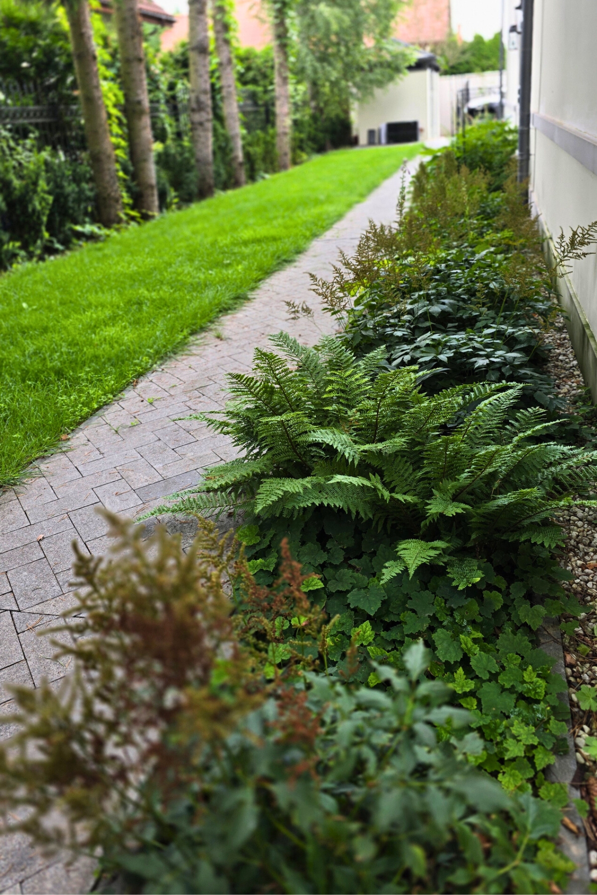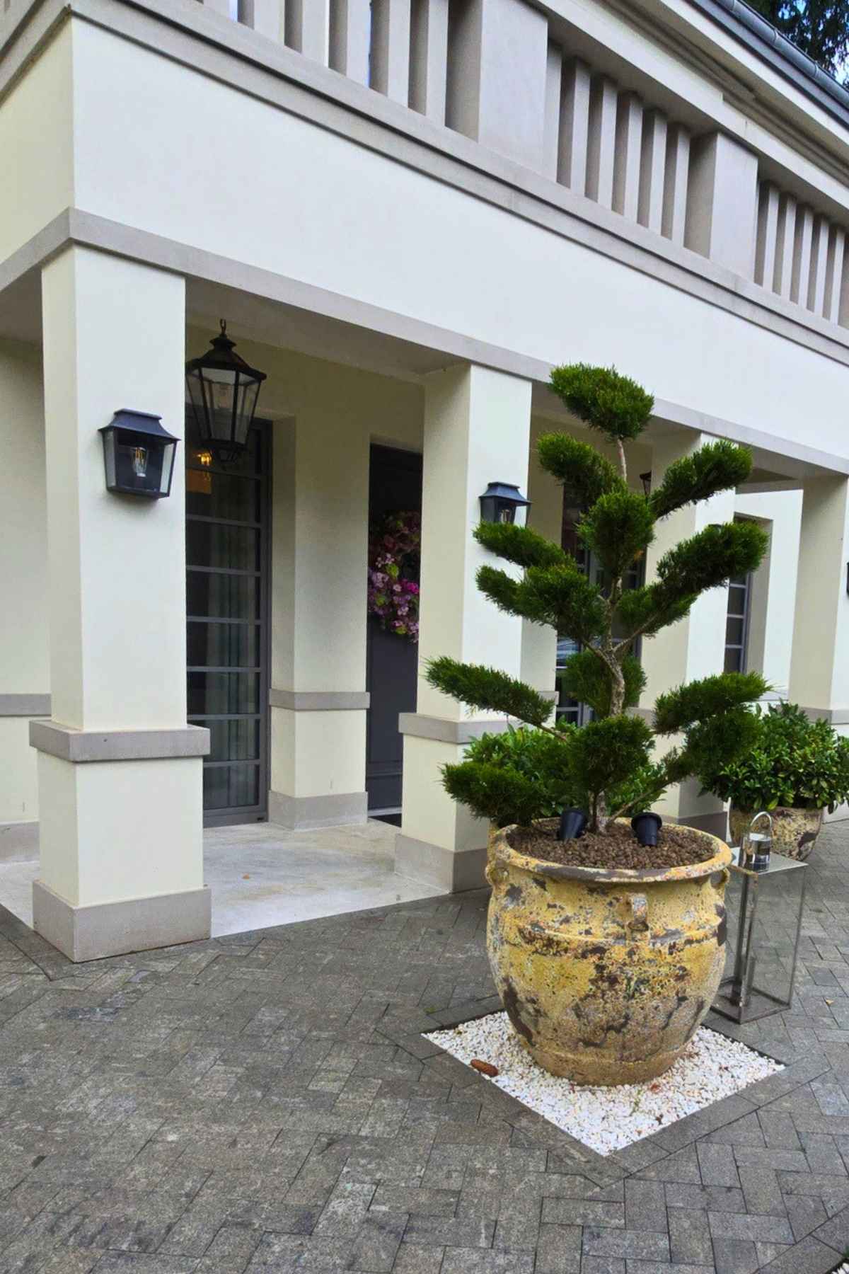 Kompozycja opiera się na spokojnych, zielonych nasadzeniach, naturalnych materiałach oraz czytelnych liniach ścieżek i rabat wykończonych szlachetnymi materialami, które podkreślają reprezentacyjny charakter miejsca. Starannie dobrane rośliny tworzą zmienny, sezonowy obraz ogrodu – od strukturalnych form zieleni po kwitnące akcenty bylin i krzewów. Akcentami są elementy wodne, donice, formowane krzewy iglaste.