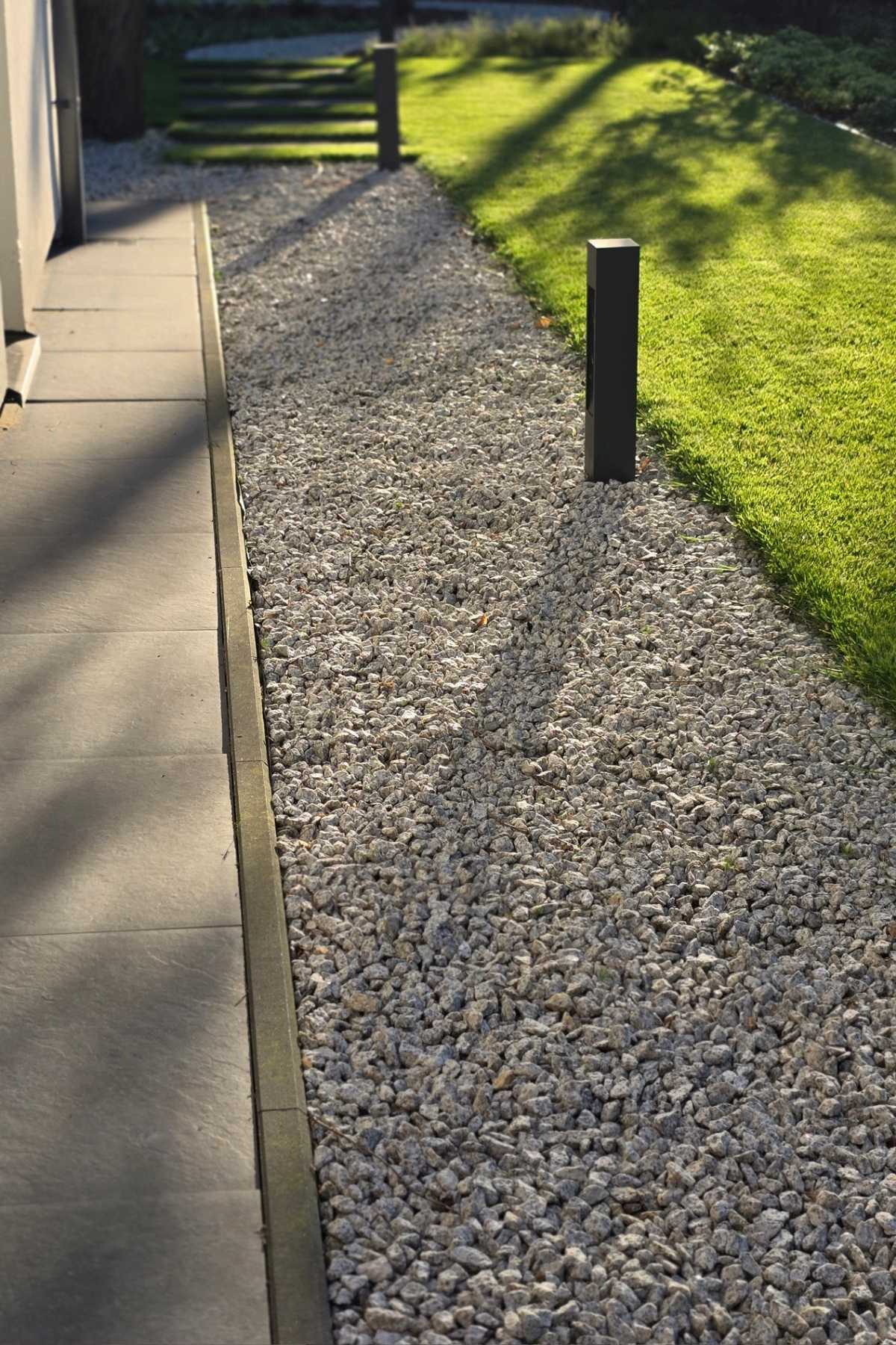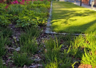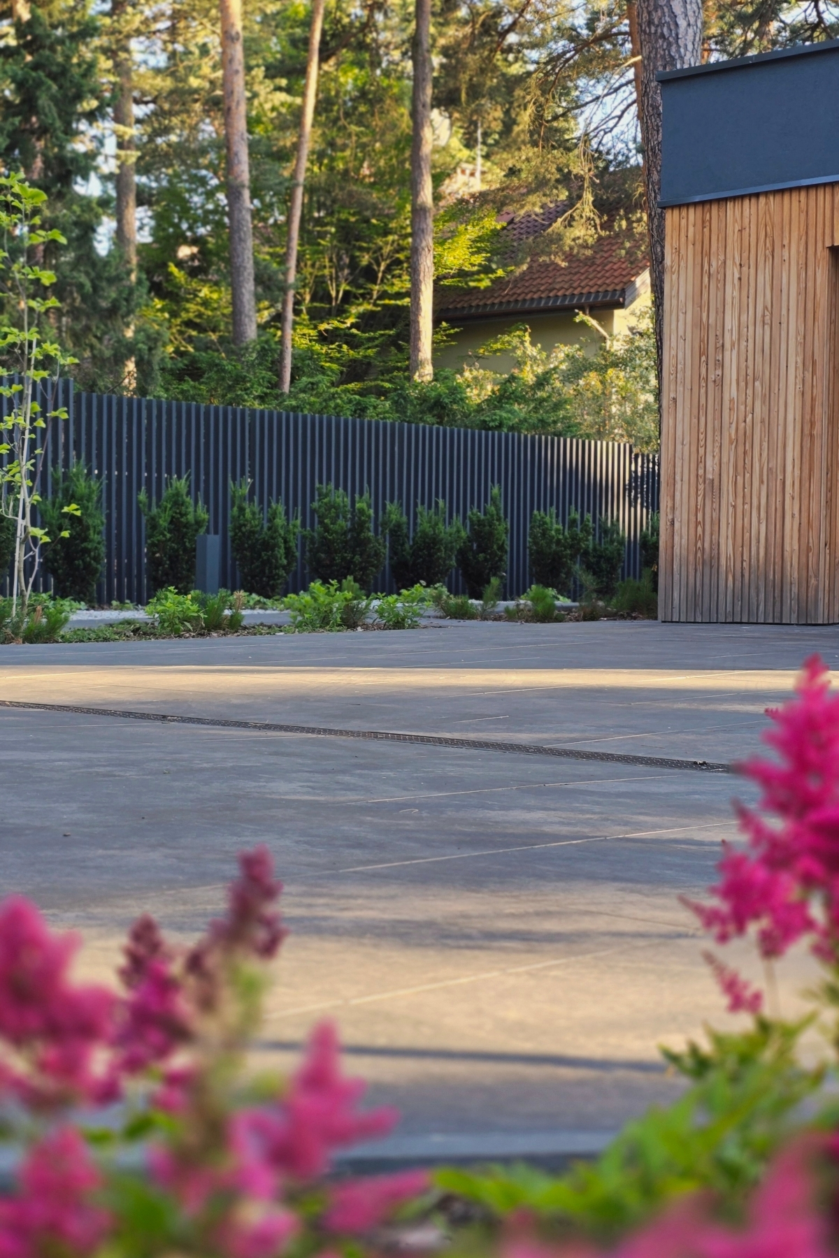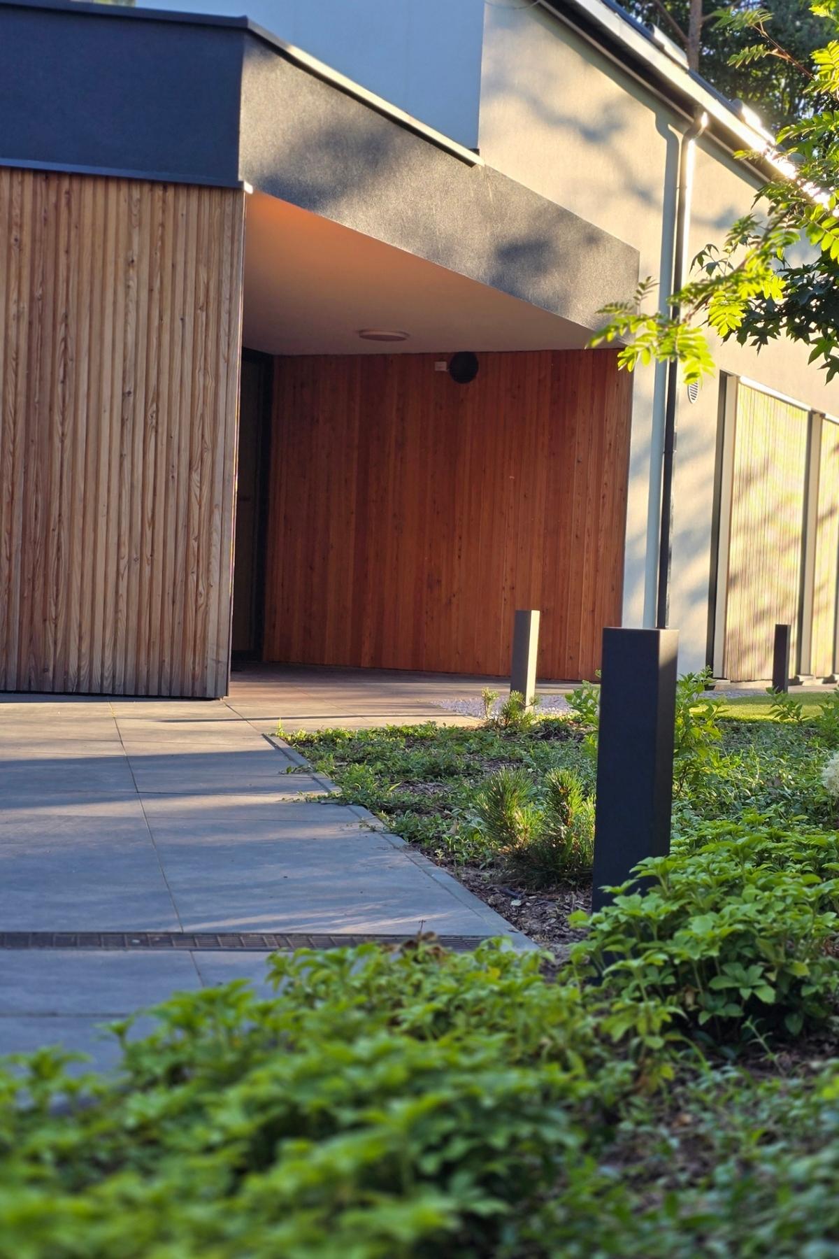 W projekcie ważną rolę odgrywa rozległy trawnik, który porządkuje przestrzeń i daje poczucie ładu, a jednocześnie pozostawia dużo miejsca do zabawy i rekreacji. Taras naturalnie łączy dom z ogrodem, tworząc wygodną strefę spędzania czasu na zewnątrz. Uzupełnieniem kompozycji są liczne krzewy i nasadzenia, które ocieplają otoczenie domu, wprowadzają sezonową zmienność i budują bardziej kameralny charakter ogrodu.