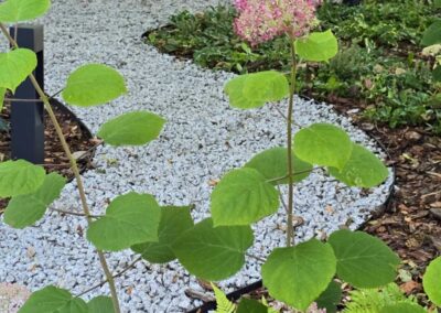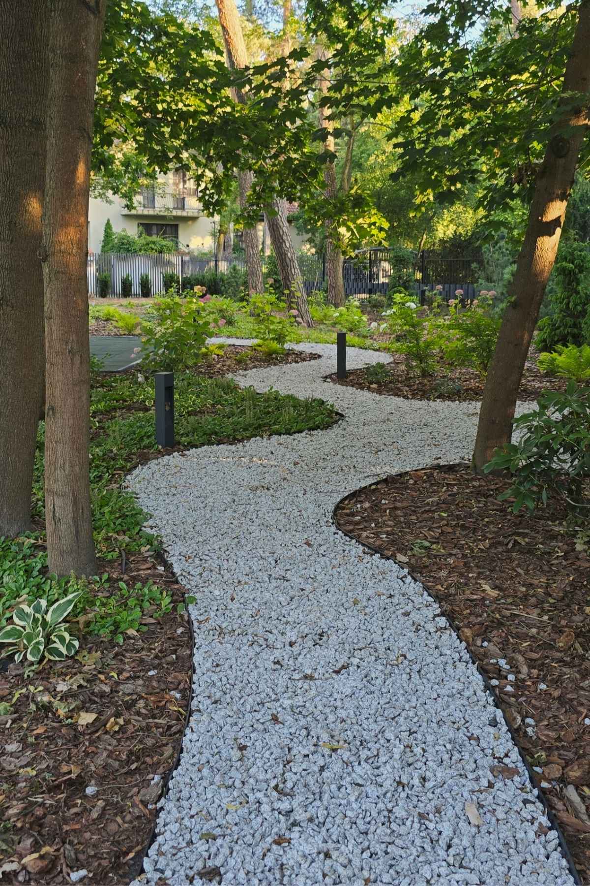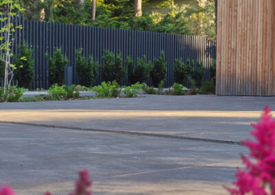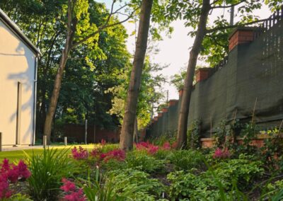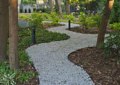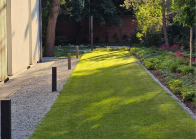 Ogród powstał przy domu położonym wśród drzew, z myślą o codziennym komforcie domowników i estetycznym uporządkowaniu całej przestrzeni. Założenie łączy reprezentacyjny charakter strefy wejściowej z wygodnym ogrodem do wypoczynku i rodzinnego użytkowania.