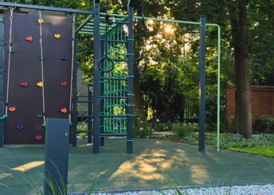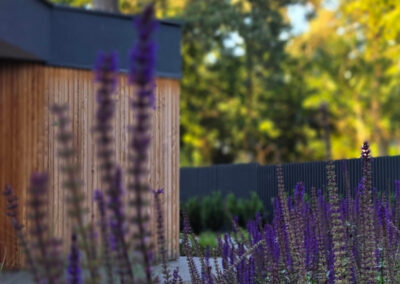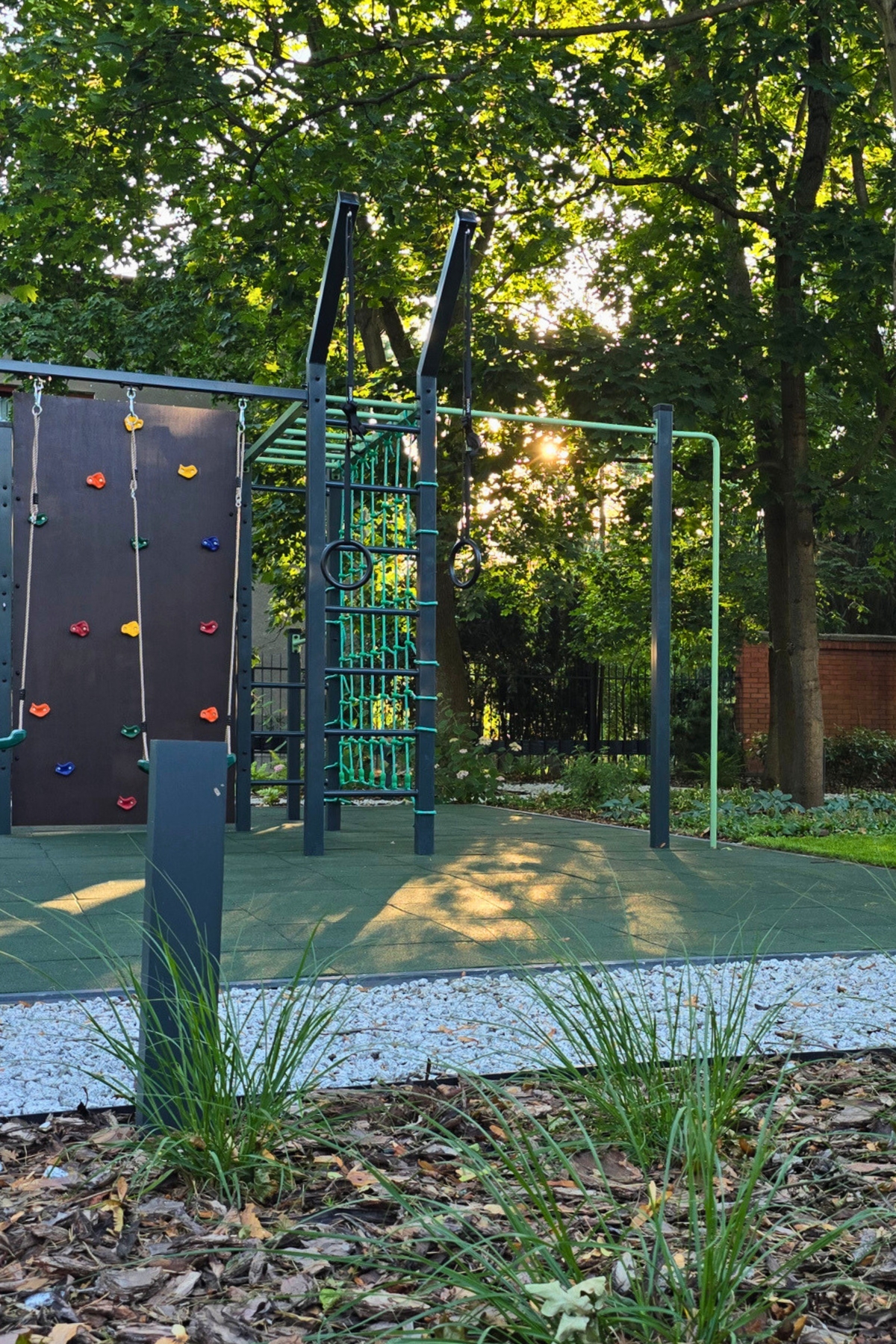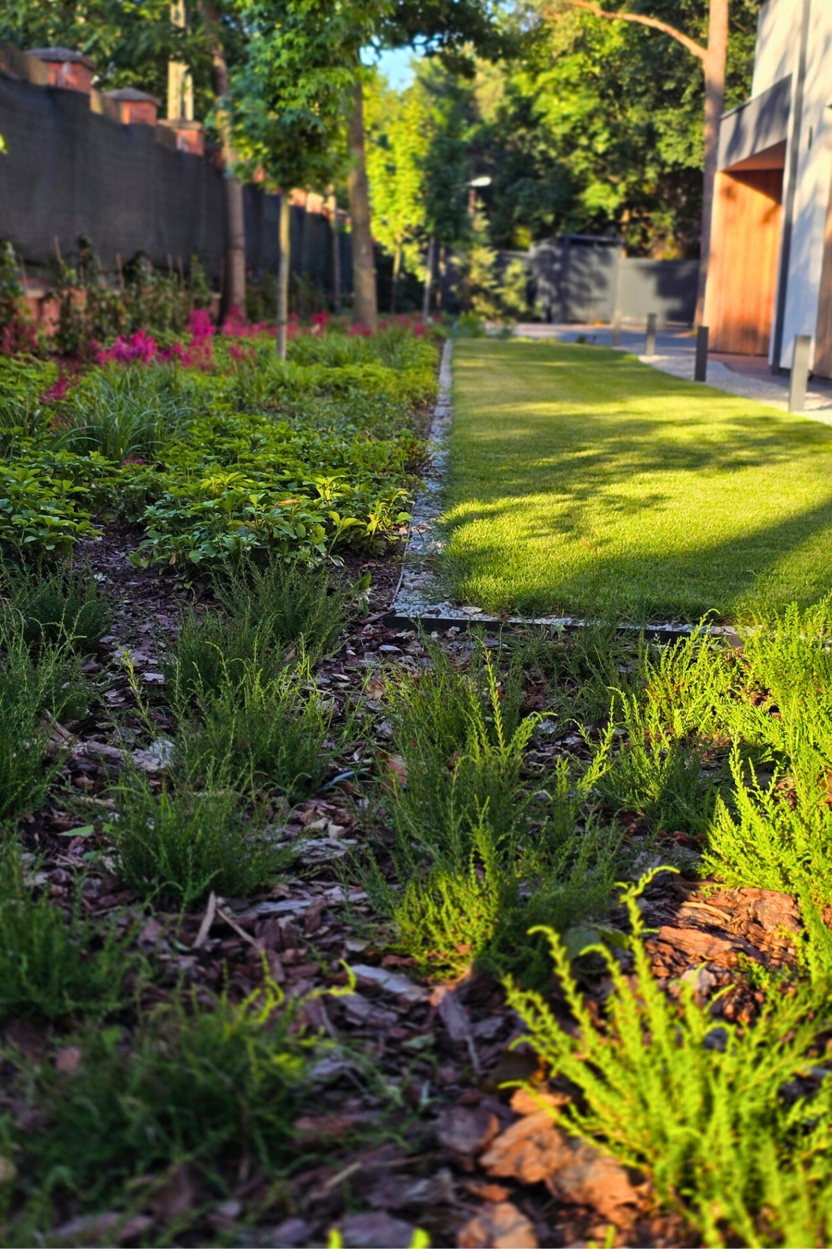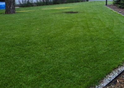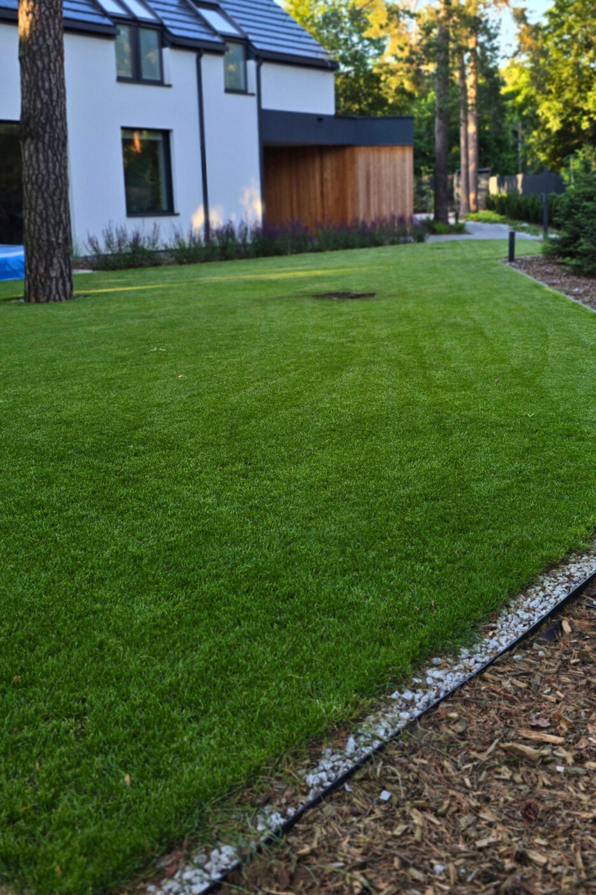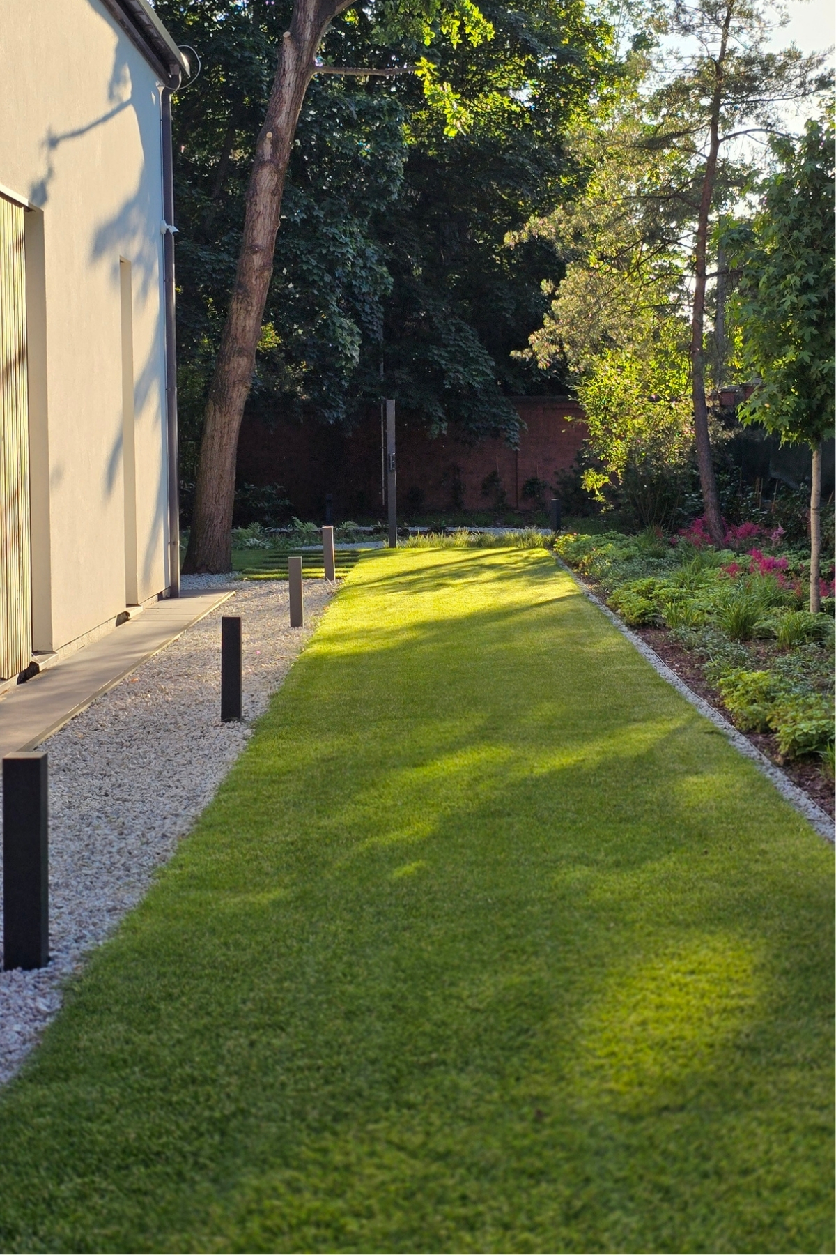 Całość została zaplanowana jako funkcjonalny ogród rodzinny – z miejscem do wypoczynku, placem zabaw i uporządkowaną zielenią, która dobrze wpisuje się w otoczenie domu i istniejący drzewostan.